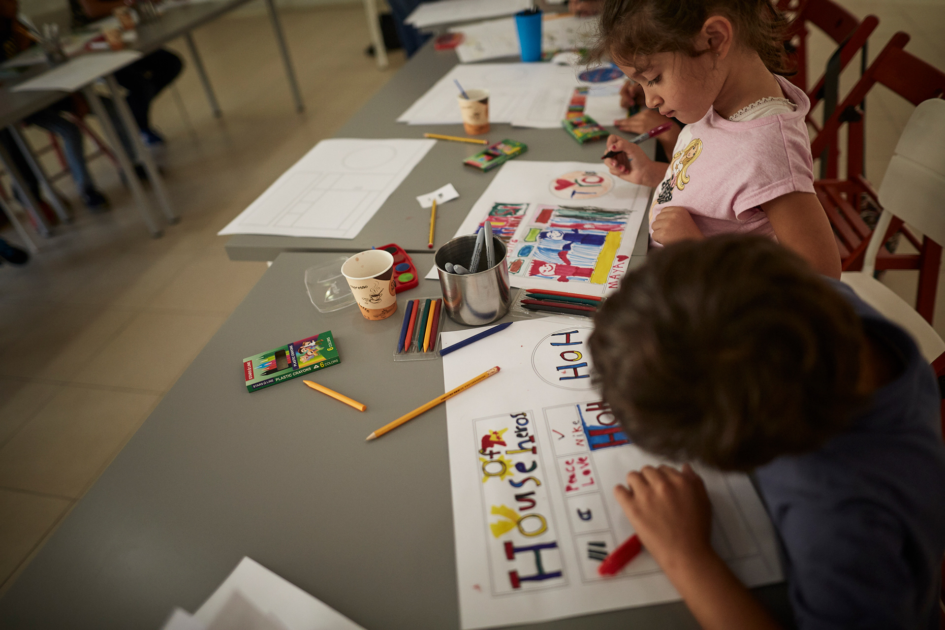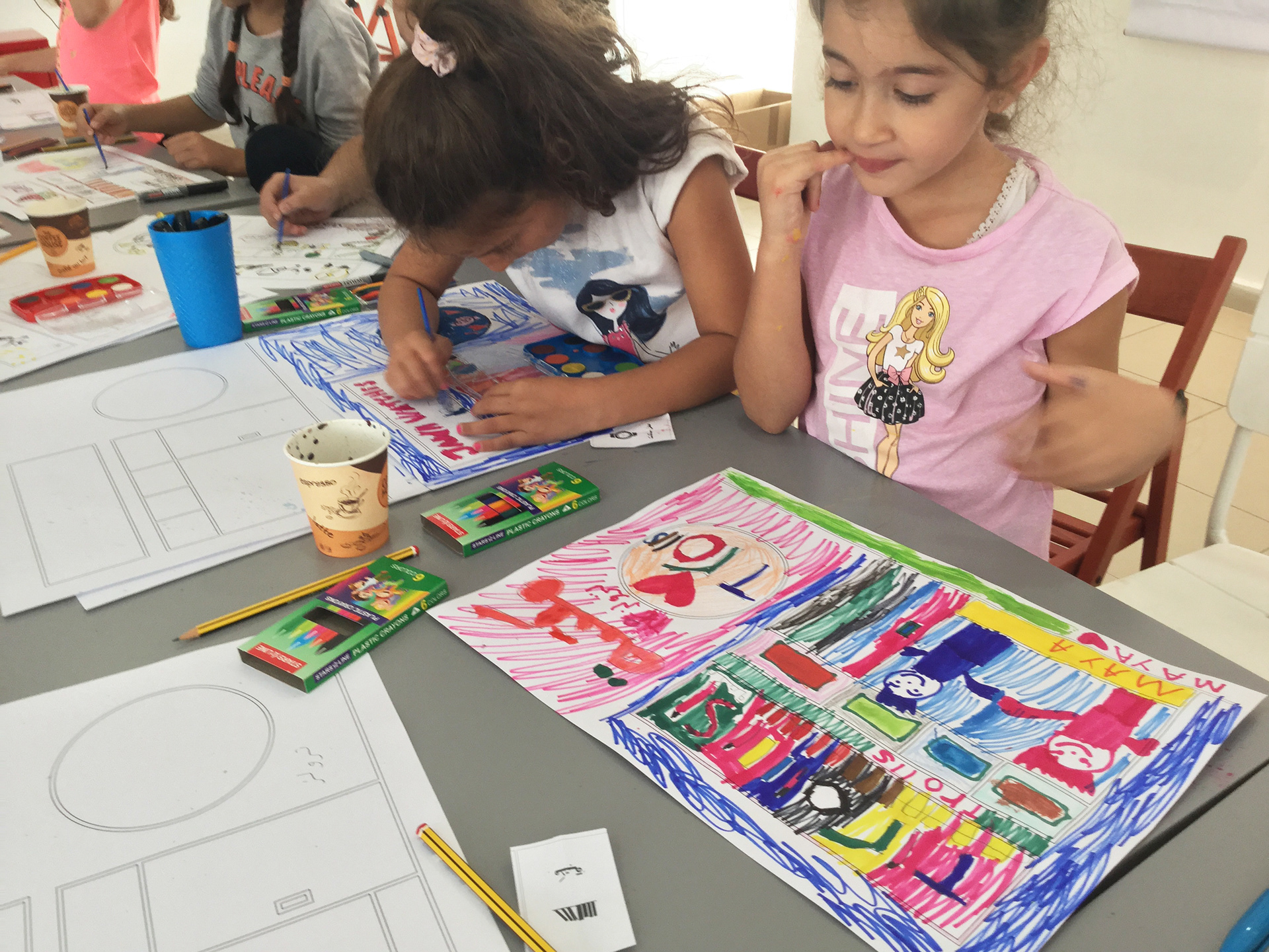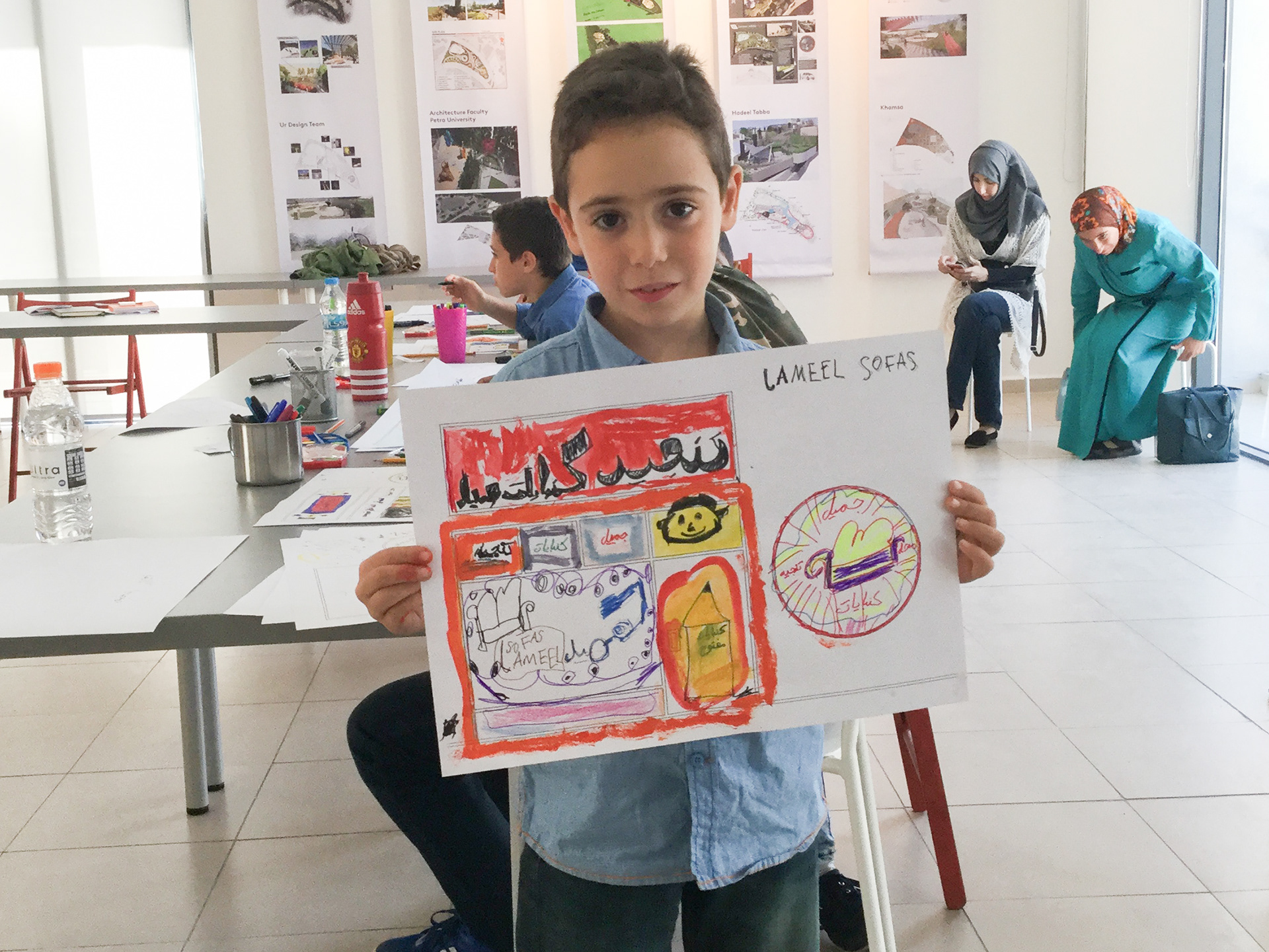 During the second edition of Amman Design Week we wanted to do something totally different, we introduce our concepts, experiences, and design thinking to children, giving them a chance to learn the basics of designing the shopfronts for various small shops. We’ve provided tools such as assisted generic icons and illustrations for different types of shops to encourage children to create their own designs, using markers and colors on blank blueprints.